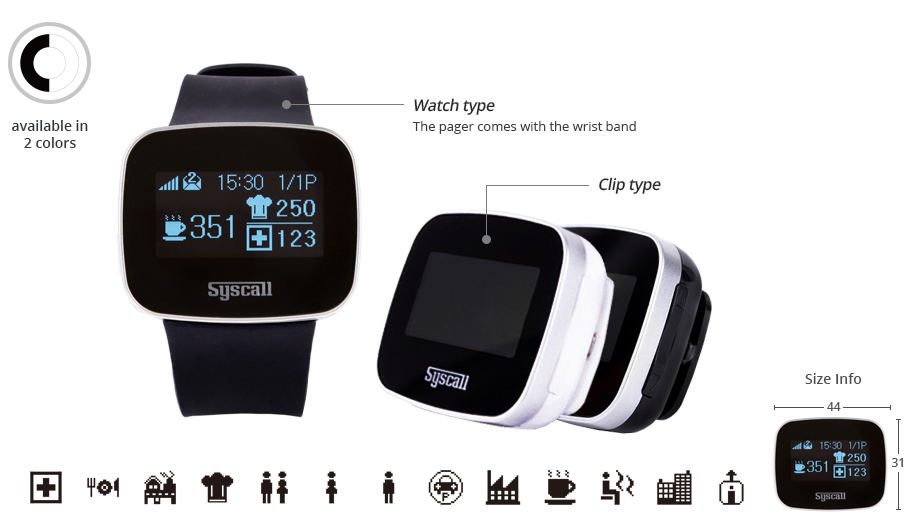 Type Watch & Clip type Dimension W44 x L31 x H17.5m Net Weight 50g Color Black, White Frequency Range FM 433MHz Battery Li-Polymer Battery (USB rechargeable) Power Consumption Standby: 9mA, Rx Max.: 150mA Compatibility All Syscall call button type transmitters & Multi transmitter (ST-5010)