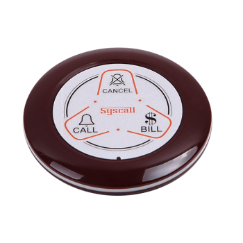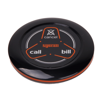 تعداد کلید بر روی پیجر 3 ابعاد Ø59 x H9mm وزن 30g رنگ مشکی نارنجی و شیری شرابی فرکانس FM 433MHz مصرف DC 3V coin battery (CR2025) عمر باتری Approx. calling 40,000 times آنتن PCB pattern antenna قابلیت اتصال به ساعت ، مانیتور و تقویت کننده